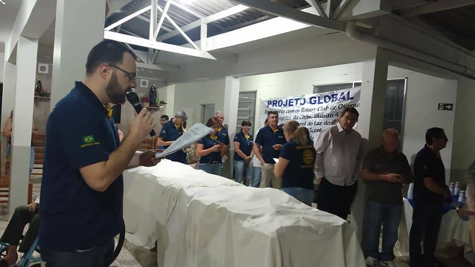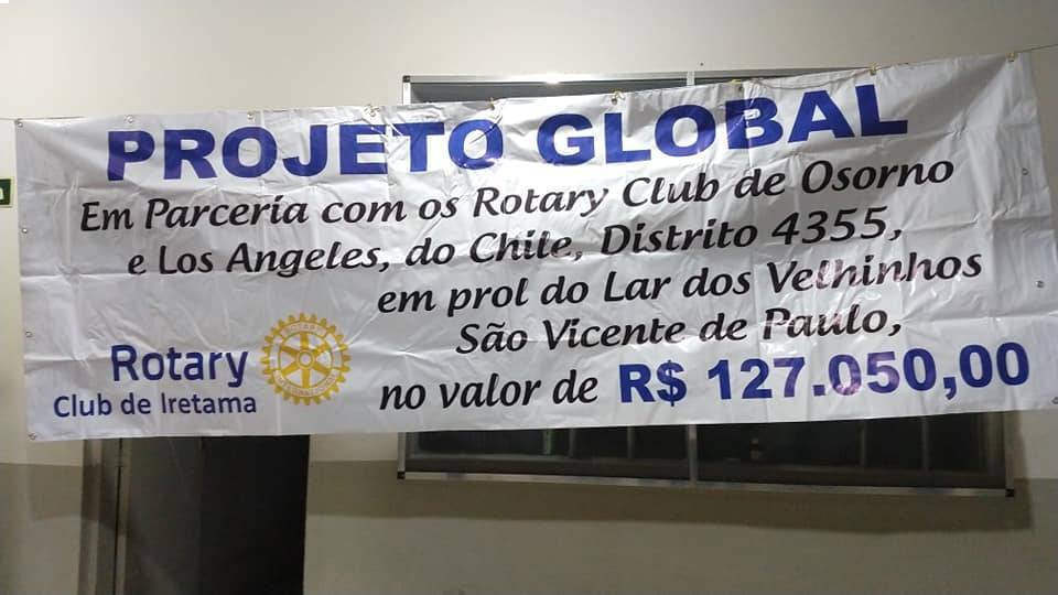 Para o Rotary Club de Iretama, foi de extrema alegria o dia 23/10/2019. Isto por que, momentos como o vivído, onde realizou-se a entrega de um projeto global, se apresenta como a coroação de todo o trabalho realizado como rotariano, passando pela captação de recursos, através da Festa da Leitoa da Terra, assim como, quando realizada a produção e venda dos empadões, além das contribuições expontaneas dos companheiros rotarianos, e as importantes contribuições mensais realizadas pelas Empresas Cidadãs, as quais são destinados a Fundação Rotária, e através da realização e apresentação de projetos, como o projeto entregue, humanitários, educacionais e da erradicação da poliomielite, prevenção e tratamento de doenças, recursos hídricos e saneamento, saúde materno infantil, paz, prevenção e resolução de conflitos, educação básica e alfabetização, e desenvolvimento econômico e comunitário, retornam multiplicados de forma exponencial. Nesta data, foi efetuada a entrega do Projeto Global no valor de R$ 127.050,00 equivalente a US$ 33.000,00, realizado pelo Rotary Club de Iretama em parceria com o Rotary Club de Osorno e Rotary Club de Los Angeles no Chile e Fundação Rotária, no Lar dos Velhinhos São Vicente de Paulo de Iretama. O projeto entregue contempla: uma lavanderia industrial; uma academia ao ar livre; dois guinchos hidráulicos; cinco camas hospitalares completas com colchões, travesseiros; suportes para soro e escada; curso de treinamento para cuidador de idosos; e reforma de dois banheiros adaptados para cadeirantes.